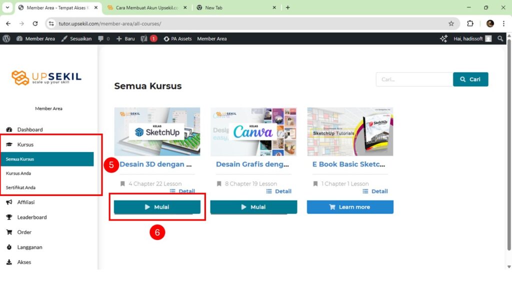 • Pilih menu [Kursus] di panel sebelah kiri untuk melihat semua kelas yang tersedia.